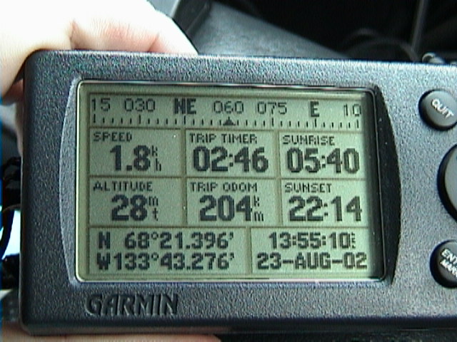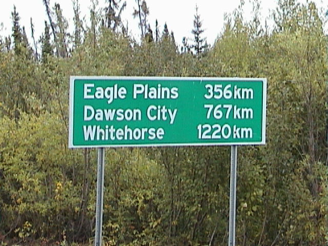 Die Fahrt verläuft eigentlich ziemlich ruhig. Jörg heizt mal wieder ganz schön und dann passiert es. Kurz vor der Grenze zum Yukon knallt er mit ziemlichen Tempo und trotz zweier "Caution"- und "Slow"-Schilder in ein mördermäßiges Schlagloch. Es rummst mächtig und schon sind die beiden hinteren Ketten, die unseren Wohncontainer auf dem Pickup halten gerissen und das Wohnteil knallt auf das Dach unseres Autos. Wir fahren ganz langsam weiter bis zur Grenze, denn erst da ist es einigermaßen gerade. Tja, dumm gelaufen. Jetzt halten nur noch zwei Ketten das Wohnteil auf dem Auto. Glücklicherweise läßt sich eine von den beiden Ketten wieder befestigen und wir haben alle Teile. Aber die andere Kette ist von dem Teil abgerissen, das sie am Auto hält. Ziemlich langsam fahren wir weiter in Richtung Eagle Plains. Daß ich sowas absolut hasse versteht wohl jeder. Ich will keinen Abenteuerurlaub. Naja, nach 2 Stunden erreichen wir Eagle Plains und an der Tankstelle machen sie kleinere Reperaturen. Innerhalb von 10 Minuten hat dieser lustige Mechaniker die Kette wieder an das Teil angeschweißt, einen Spanner zurechtgebogen und das ganze wieder am Auto befestigt. Und das um 9 Uhr abends. Aber das beste daran: Es kostet uns nur schlappe 10 kanadische Dollar. Sowas in Deutschland? Jetzt haben wir aber wirklich genug und so übernachten wir in Eagle Plains. Eagle Plains hat übrigens satte 8 Einwohner.