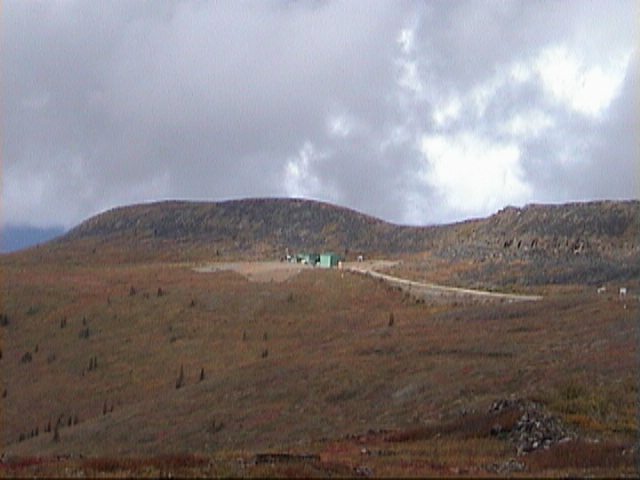 Bevor wir auf dem Top Of The World Highway nach Alaska fahren, werfen wir am Postamt von Dawson City noch schnell die Postkarten ein, die wir geschrieben haben. Außerdem machen wir einen kurzen Abstecher in einen Souvenirladen und kaufen uns mal wieder ein paar T-Shirts. Wenn das so weitergeht, dann müssen wir uns noch einen zusätzlichen Koffer kaufen für all den Quatsch, den man als Tourist so mitnimmt. Um auf den Top Of The World Highway zu gelangen, muß man erstmal mit einer kostenlosen Fähre über den Yukon übersetzen. Die Fähre hat ganz schön zu tun, um gegen die Strömung anzukommen. Sie überquert den Fluß ziemlich schräg. Auf der anderen Seite geht es ganz schön hoch und wir sind auch schnell in den Wolken drin, so daß es sich ziemlich doof fährt: Schotterstraße und extrem dichter Nebel mit einer Sichtweite von unter 50 Metern.