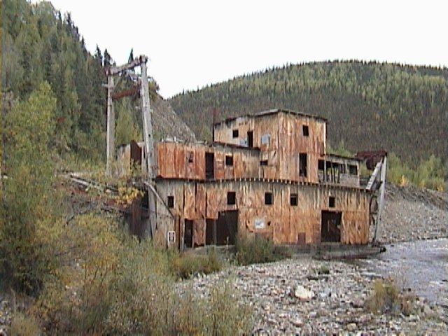 Es geht nun wieder abwärts. Die Qualität der Straße geht auch einigermaßen und so stoßen wir bald auf die Jack Wade Dredge. Eine Dredge ist ein ziemlich großer Schwimmbagger, der ein Flußbett nach Gold durchschaufelt uns sich dadurch auch vorwärtsbewegt. Benutzt wurden solche Teile von circa 1910-1950. Die Jack Wade Dredge liegt jetzt irgendwo in der Landschaft rum.