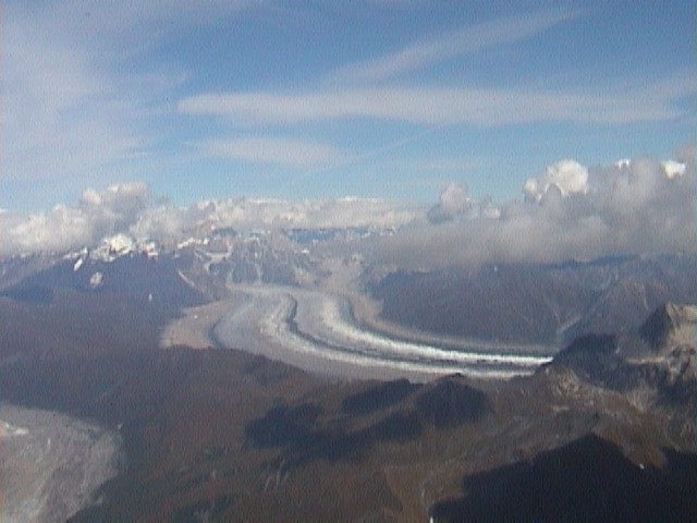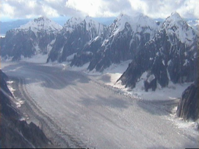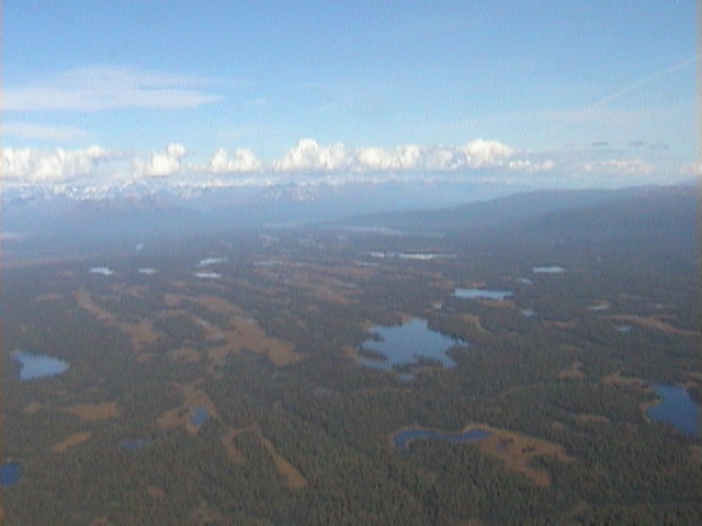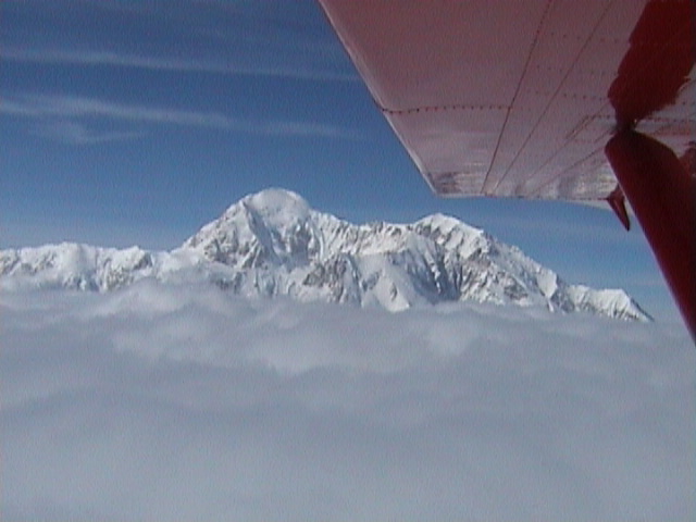 Die Sitze sind ein bißchen unbequem, aber für 1,5 Stunden wird es schon gehen. Der Pilot macht noch eine kleine Sicherheitseinweisung (Notausgänge bei den Tragflächen, wo die Lebensmittel für einen eventuellen Absturz liegen usw.) Auch fragt er den Mann, der beim Feuerlöscher sitzt, ob er damit umgehen kann. Dieser antwortet mit ja, worauf seine Frau erwidert, daß sie ihm nicht vertrauen würde. Und schon haben alle was zu lachen. Wir setzen nun alle Kopfhörer auf, denn der Pilot erzählt während des Fluges ein paar Sachen. Es gibt auch eine Taste zum drücken und dann kann man mit dem Pilot reden. Jetzt geht es aber los. Die Otter hebt kaum merkbar und schon nach kurzer Zeit ab und wir fliegen in Richtung Denali. Alle zücken ihre Video- und Fotokameras. Und deshalb gibt es hier jetzt mal ein paar Bilder.