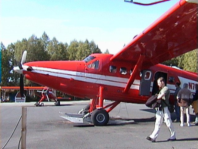 Wir fahren kurz vor 12 Uhr zu K2 Aviation und bezahlen den Flug. Anschließend setzen wir uns auf die Terrasse und warten, daß es losgeht. Das Wetter ist absolut genial und mir ist es schon viel zu warm in der Sonne. Nach einem Weilchen kommt der Pilot und führt uns und 8 andere Leute (alle schon etwas älteres Semester) zum Flugzeug. Es ist eine DeHaviland Otter mit dem Baujahr 1961 (gebaut wurde sie, um genau zu sein, von DeHaviland Aircraft of Canada Inc.).