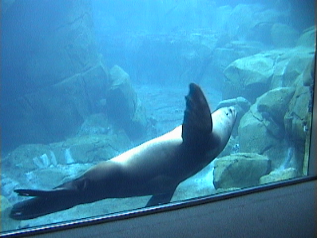 Eine ziemlich große Robbe. Sie schwimmt andauernd am Fenster vorbei und die Leute kreisen alle total aus.
