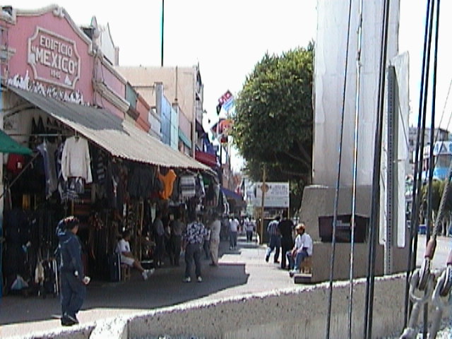 Man geht nun durch eine zweite Einbahnstraßen-Drehtür und plotzlich steht man mitten in Mexiko. Und schon kriegen wir voll den Kulturschock. Alles ist irgendwie ärmlicher und überall stehen fliegende Händler und versuchen irgendwelchen Schnickschnack an die Touristen zu verkaufen. Wir beschließen, den Schildern in Richtung Innenstadt zu folgen. Auf dem Weg dahin werden wir andauernd von Leuten angesprochen, ob wir nicht was kaufen wollen oder ob wir nicht mal in diesen oder jenen Laden gehen wollen. Jörg achtet da garnicht drauf. Ich versuche wenigstens ab und zu mal ein "No, thanks" zu murmeln. Wir werden auch von ein paar Kindern angebettelt, die vielleicht erst 4 oder 5 Jahre alt sind.