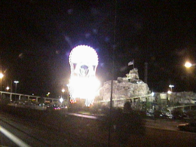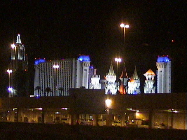 Wir fahren aber ohne anzuhalten weiter. Die Sonne geht schon wieder unter und es wird dunkel. Naja, was auch sonst. Also geht es im Dunkeln durch die Mojave-Wüste nach Nevada. Genau an der Grenze zwischen Kalifornien und Nevade geht es mit den Kasinos los. Riesige Leuchttafeln strahlen einen an und ich filme drauf los. Eine von den Tafeln strahlt plötzlich so hell, daß ich denke, die Kamera spinnt. Das ist so absurd, daß wir erstmal laut loslachen müssen und uns fast nicht mehr einkriegen. In einiger Entfernung sieht man schon eine richtig helle Glocke am Himmel. Also ist Las Vegas nicht mehr weit und als wir dann ankommen ist das schon ziemlich heftig. Überall leuchtet und blinkt etwas. Sogar das Motel 6 hat eine flackernde und flimmernde Werbetafel.