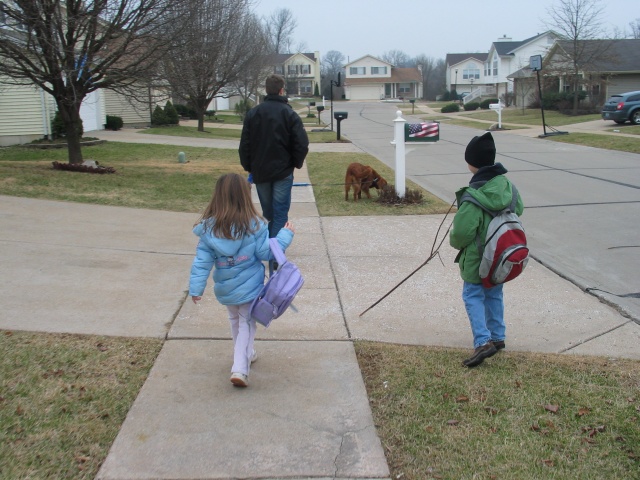 Nach kurzer Zeit geht Amy los und fährt zur Arbeit und Jörg, der mittlerweile aufgestanden ist, macht Frühstück für die Kinder. Es gibt Honeynut Cherios mit Milch. Da der Schulbus um 8:30 fährt, machen wir uns fünf Minuten vorher auf den Weg. Mitsamt Hund, der sich tierisch darüber freut, daß mal jemand mit ihm rausgeht. Ansonsten sitzt der nämlich nur in der Wohnung oder rennt ein bißchen im Garten rum. Kein Wunder, daß der auf Diät gesetzt wurde.
