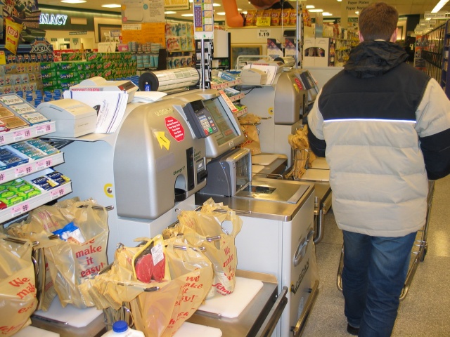 Zur Beruhigung der älteren Menschen gibt es aber auch noch die normalen Kassen, wo einem der Einkauf von einem netten Menschen gleich in eine Tüte gepackt wird.
