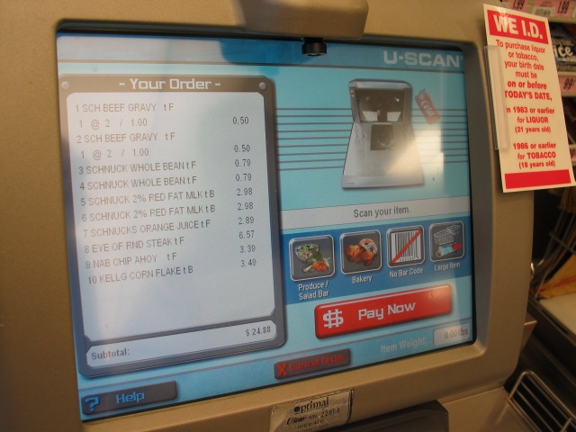 Nachdem wir alles für das Abendbrot gefunden haben, kommt nun das absolute Highlight: Die Kasse zum Selbereinscannen. Ein Meisterwerk an Technologie! Als erstes nimmt man seine ganzen Waren und zieht den Strichcode über den Laser, genau so, wie das bei uns immer die Kassiererinnen machen. Allerdings kann man das nächste Produkt erst einscannen, wenn man das vorherige auf eine vorbestimmte Ablagefläche gelegt hat. Da wird nämlich mitgewogen und überprüft, ob man nicht schummelt.