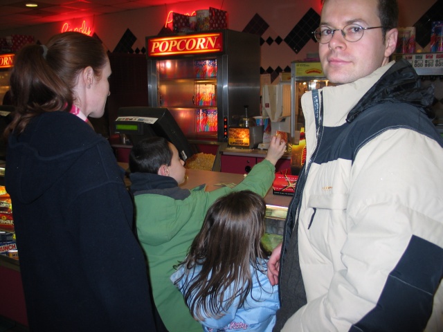 Amy ruft an und meint, daß sie gleich kommt und daß wir dann alle ins Kino gehen können. Also werden die Kinder schnell in warme Klamotten verpackt und dann geht es los. Wir kucken uns "Racing Stripes" an, ein Film, in dem es um ein Zebra geht, das unbedingt beim Pferderennen mitmachen will. Die Tiere können alle sprechen und obwohl es ein Kinderfilm ist, hat man auch als Erwachsener manchmal ganz schön was zu lachen. Zum Schluß gibt es natürlich ein Happy End(ing), denn das Zebra gewinnt beim großen Preis von Kentucky. Upps, jetzt hab ich ja schon alles verraten, tut mir leid, wenn ihr euch den Film noch ankucken wolltet.