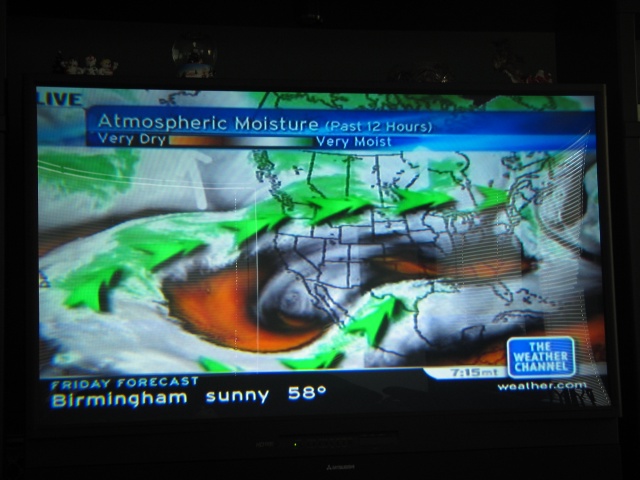 Nachdem wir die Kinder zum Schulbus gebracht haben, entspannen Jörg und ich erstmal ein bißchen. Ich allerdings ein bißchen mehr, denn Jörg fängt noch an, das Badezimmer zu putzen. Ich schalte mich derweil ein wenig durch das äußerst reichaltige Fernsehangebot von DirecTV und bleibe beim Weather Channel hängen.