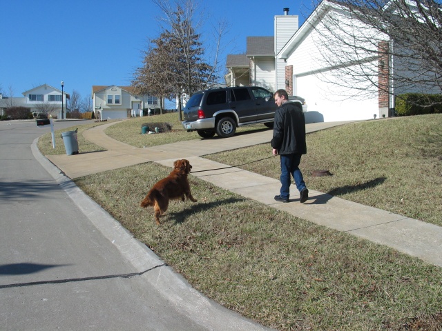 Da das Wetter heute richtig toll ist, Sonnenschein und 15 Grad, machen wir nach unserer Rückkehr nach Hause noch einen Spaziergang um den Block mit Casey. Die freut sich natürlich wieder richtig.