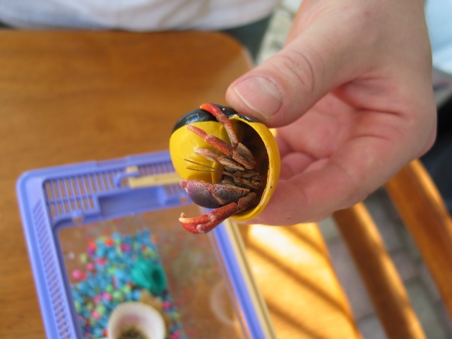 Nach einer halben Stunde sind wir zurück und man merkt, daß Casey nicht so oft raus kommt. Die ist nämlich ganz schön am japsen und Zunge raushängen lassen. Also legt sie sich gleich ins Wohnzimmer und macht erstmal ein Nickerchen. Der Hund ist hier übrigens nicht das einzige Haustier, es gibt im Badezimmer noch eine Plastikbox, da wohnt eine Krabbe drin. Meistens versteckt die sich in so einem Schneckenhaus.