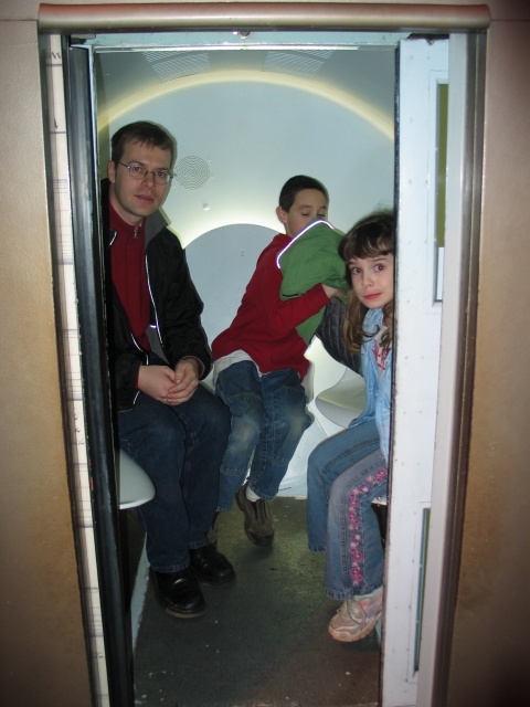 Um nach oben zu gelangen, muß man mit einer sehr merkwürdigen Bahn fahren. Die besteht im Prinzip aus mehreren runden Passagierkabinen, die wie an einer Kette aufgereiht sind und die sich in jede beliebige Richtung bewegen können. Zum Anfang fährt man nach rechts, dann wackelt es mächtig und dann geht es aufwärts. Und kurz vor Schluß geht es dann wieder nach links. Naja, alles besser, als die über tausend Stufen zu laufen, sind ja schließlich 192 Meter bis ganz nach oben. Die Kabinen sind ganz schön eng und man muß aufpassen, daß man sich den Kopf nicht stößt. Wahrscheinlich haben die damals in den 60er Jahren nicht damit gerechnet, daß die Amis mal so verfetten. Ein dicker Mensch hätte nämlich schon Probleme, durch die Tür zu kommen. Oder das ist Absicht, damit der Bogen nicht zu sehr belastet wird.