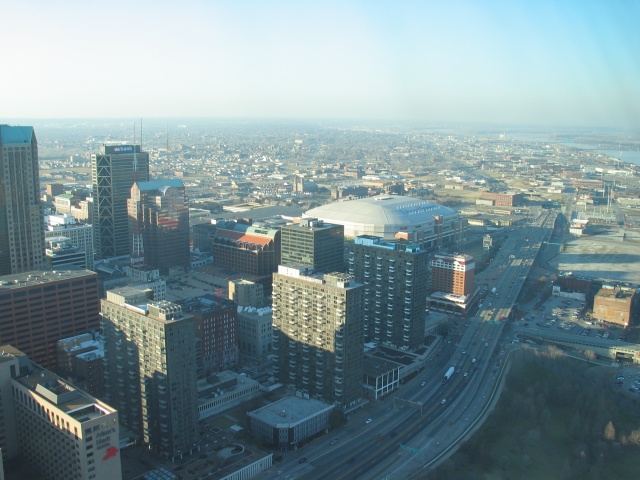 Downtown St. Louis mit dem Edward Jones Dome. Dort spielen die St. Louis Rams, ein Footballteam, und es passen 66000 Menschen hinein. |