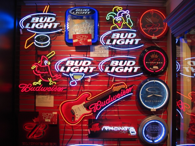 Es gibt auch tolle Läden, zum Beispiel den "Bud Shop". In St. Louis ist die nach eigenen Angaben größte Brauerei der Welt, Anheuser-Busch, beheimatet, der Hersteller von Budweiser. Und im "Bud Shop" gibt es nun sämtliches Zubehör zum Bier. Zapfhähne, Bierdeckel, T-Shirts, ... und und und. Am besten sind aber diese typischen Leuchtschilder, die wären was für meine neue Küche. Obwohl ich ja keinen Alkohol trinke.
