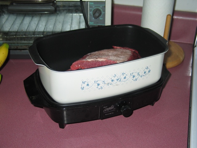 Bevor es aber losgeht, gibt es mal wieder ein Wunderwerk der Technik zu bestaunen. Jörg setzt nämlich schon um 10 Uhr vormittags das Abendessen auf. Das geht mit Hilfe eines Gerätes namens "Slow Cooker". Ich hab keine Ahnung, wie das funktioniert, aber Jörg packt einfach das Rindfleisch rein, kippt ein bißchen Wasser drauf und schaltet das Teil ein. Ich habe ja ein paar Bedenken, ob das nicht irgendwie anbrennt oder so, aber er meint, das wird schon. Nagut, laß ich mich mal überraschen.