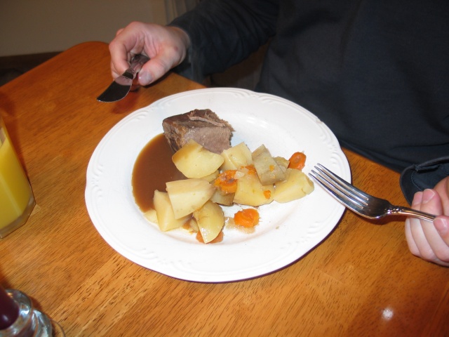Nachdem das Fleisch sage und schreibe 10 Stunden im "Slow Cooker" vor sich hingekocht hat, ist nun der Augenblick der Wahrheit gekommen: Es gibt Abendbrot. Und ich muß sagen, das funktioniert! Gut, die Kartoffeln und die Möhren hätten vielleicht ein, zwei Stunden früher rein gemußt, aber man kann es essen und es schmeckt gar nicht mal so schlecht.