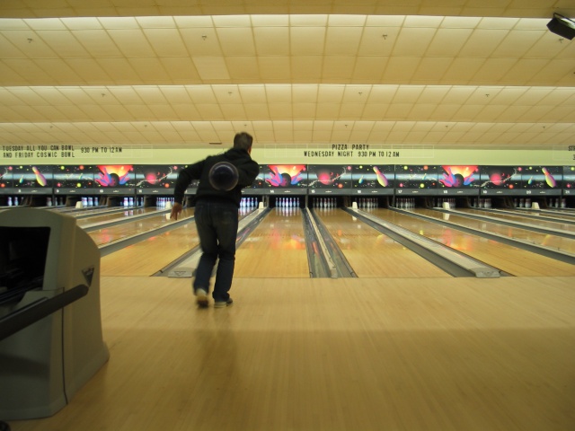 Aber ich war ja beim Entspannungstag. Nachdem ich gefrühstückt und Jörg ein bißchen beim X-Box spielen zugekuckt habe, fahren wir zur nächstgelegenen Bowlingbahn um ein wenig dem vormittäglichen Sport zu fröhnen. Das Gebäude sieht von außen eher klein aus, hat aber tatsächlich 24 Bahnen.