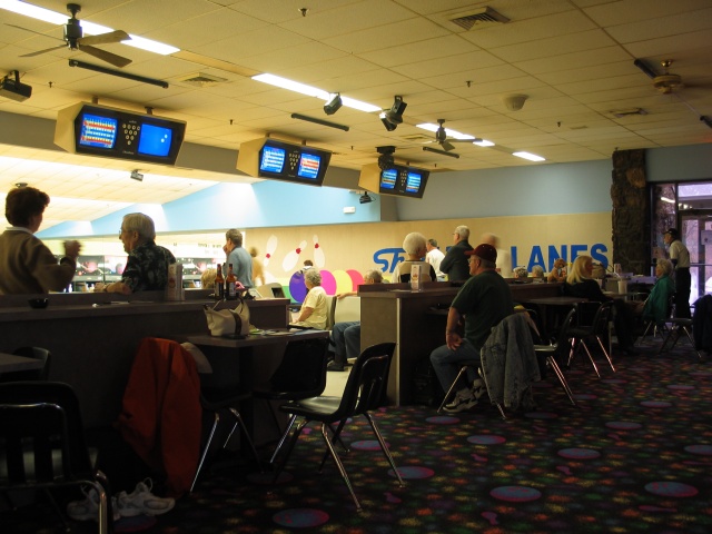 Am faszinierendsten sind aber die ganzen Rentner, die hier spielen. Zwei Bahnen neben uns fetzt Gene los. Gene sieht aus, als wäre er 75, hat aber seine komplette Ausrüstung dabei: Vier Kugeln, Polstereinsätze für die Löcher, ein Handtuch zum Nachpolieren der Kugel und dieses komische Handteil, was die Profibowler immer anhaben. Und dafür, daß er so alt ist, spielt er auch richtig gut. So richtig mit Reindrehen der Kugel, nicht so ein Billigwurf, wie ich ihn immer mache. Also so schnurgerade.
