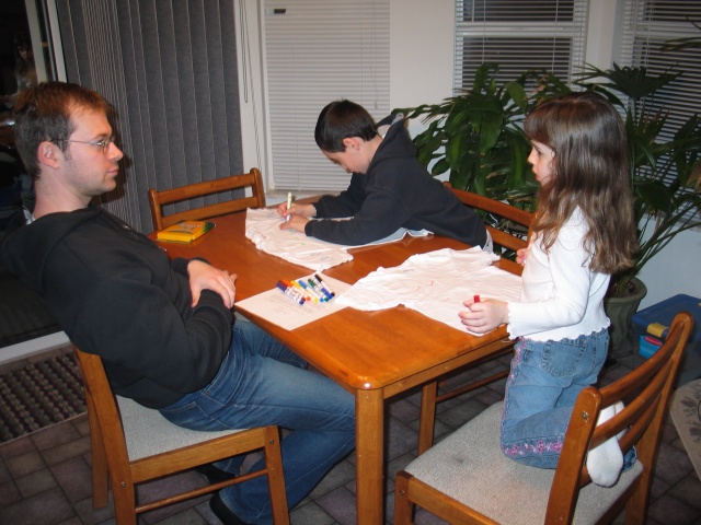 Die Kinder müssen natürlich erstmal ihre Hausaufgaben machen und dazu gehört das Bemalen des T-Shirts. Sowas tolles hab ich übrigens nie aufbekommen.