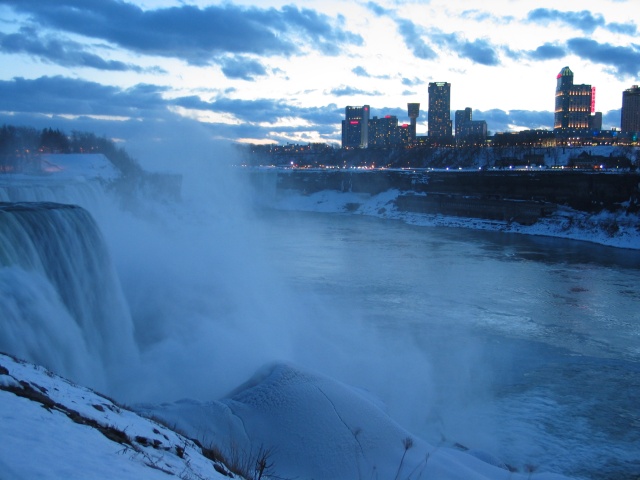 Es ist ganz schön kalt und ich als Autotourist hab mir natürlich nur kurz eine Jacke übergeworfen. Also mach ich schnell ein paar Fotos und verziehe mich dann in mein schönes warmes Auto, um die restlichen paar Kilometer bis zu Sebastian in Hamilton, Ontario zurückzulegen. Für die Brücke über den Fluß unterhalb der Fälle muß man mal wieder Maut bezahlen, satte 2,50 Dollar (US). Dahinter kommt dann gleich die Paßkontrolle. Es gibt wieder die üblichen Fragen, was ich in Kanada mache, ob ich schon mal da war und ob ich irgendwelchen Alkohol oder Drogen dabei habe. Hab ich doch nicht nötig...