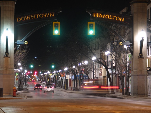 Der Eingang zu Downtown Hamilton. Aber das habt ihr euch wahrscheinlich schon gedacht. Dafür, daß es nachts um 1:00 Uhr ist, ist noch ganz schön viel los. |