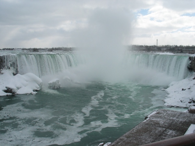 Es ist immer noch mächtig kalt und da laufen wir einfach mal zum Hard Rock Cafe, wärmen uns dort kurz auf und machen noch andere Sachen, die hier aber nicht enthüllt werden. Anschließend geht es entlang der Wasserfälle zurück zum Hauptgebäude für die Touristen. Dieses befindet sich direkt neben dem Horse Shoe Fall und man steht nur wenige Meter neben dem Abgrund, in den das Wasser hinunterrauscht.