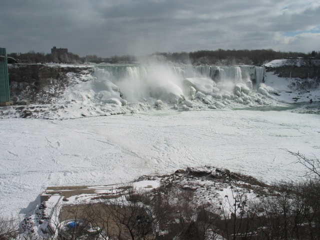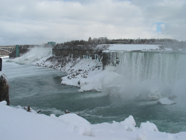 Nach dem tollen Shopping machen wir uns dann aber auf den Weg zu den Niagarafällen, die ich dann doch noch mal im Hellen und von der kanadischen Seite aus sehen wollte. Das gute an der Fahrt ist, daß es im Auto schön warm ist, im Gegensatz zu draußen. Da sind nämlich -11 Grad und Windchill -20 Grad. Man sieht die Abgase vom Auto selbst noch, nachdem man 100 Kilometer gefahren und der Motor auf jeden Fall warm ist.