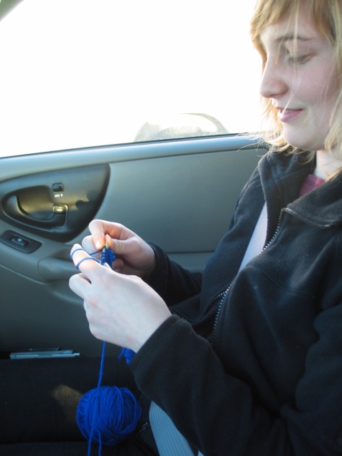 Julia hat nach einem kleinen Nickerchen ihr Strickzeug ausgepackt. |