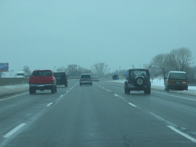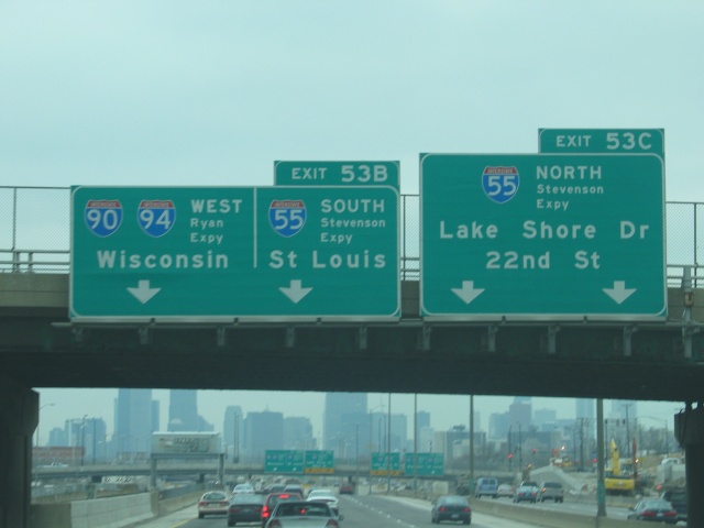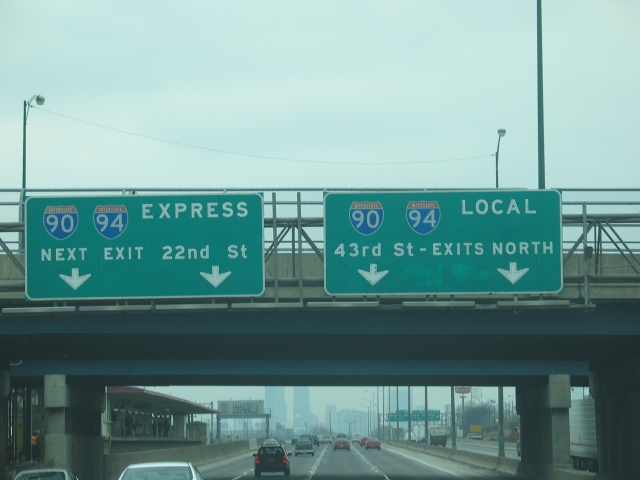 In Chicago gibt es für die Interstate 94, auf der ich fahre, zwei Teile. Einmal einen Express-Teil, bei dem man nur bei bestimmten Abfahrten und einen Local-Teil, wo man überall abfahren kann. Demzufolge gibt es dann ein paar Spuren mehr. |