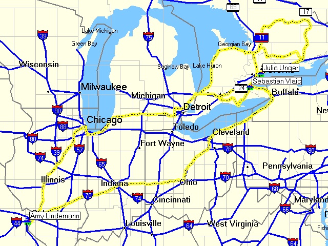 Mein Weg führt mich an Detroit vorbei nach Westen in Richtung Chicago. Dabei komme ich durch die Bundesstaaten Michigan, Indiana und Illinois. Von Chicago geht es dann in Richtung Süden die ganze Zeit durch Illinois, bis auf das allerletzte Stück, das ist dann natürlich in Missouri.