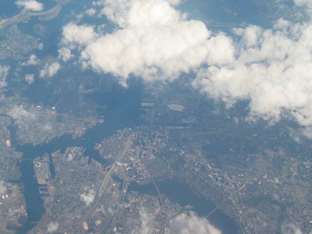 Wir fliegen mittlerweile über die Ostküstenstaaten. Unten kann man auf einmal eine große Stadt sehen und auf der Karte im Flugzeug sieht man, daß wir genau über Boston, Massachusetts sind.