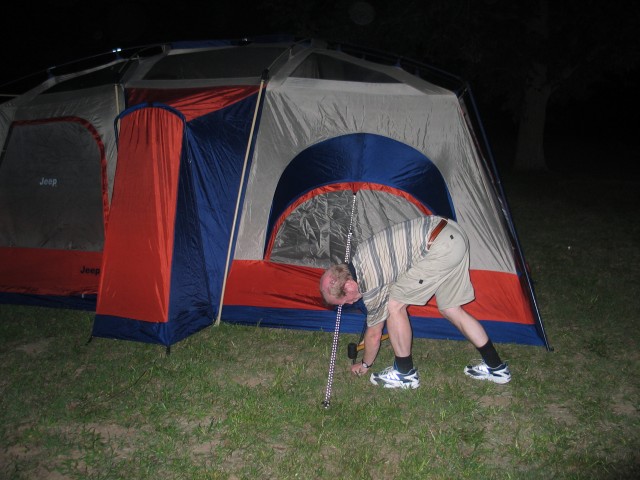 Es ist schon fast dunkel, als wir im Zielort ankommen. Wir überlegen uns, daß wir vielleicht das Restlicht ausnutzen sollten, um das Zelt aufzubauen und erst anschließend essen zu gehen. Letztlich brauchen wir dann aber doch die Scheinwerfer vom Suburban.