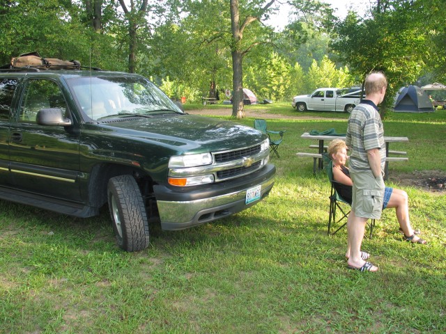 Heute ist Entspannungstag und so liegen wir eigentlich nur entweder in der Sonne (meine Mutter), im Schatten (ich), rennen herum und erkunden die Landschaft (mein Vater) oder toben im Wasser (Nick und Bella). Nur Jörg und Amy müssen sich abwechselnd um Daniel kümmern. Zwischenzeitlich kommt auch noch der Mann der Zeltplatzkioskbetreiberin und gibt dem Suburban Starthilfe. Der springt nämlich immer noch nicht an.