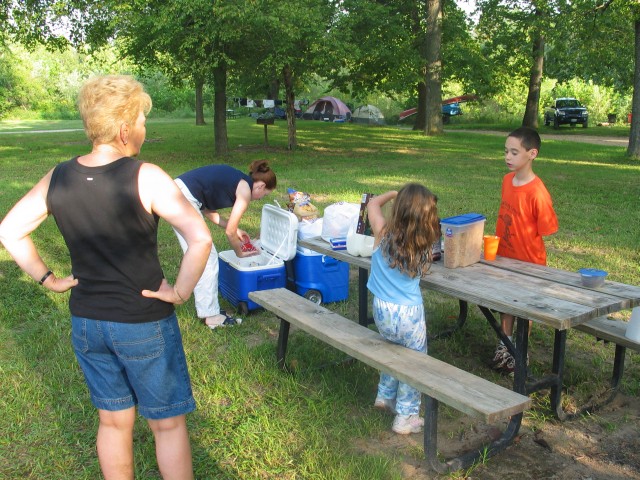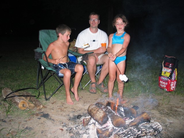 Zu einem richtigen Campingausflug gehört natürlich nicht nur in Europa, sondern auch in den USA, ein Lagerfeuer. Für die Kinder gibt es dann aber die ultimative Tradition: Das Rösten von Marshmellows. Macht kein Mensch in Europa, aber hier ist das das absolute Highlight. Die gerösteten Marshmellows werden zusammen mit Schokolade zwischen zwei Kekse gepreßt und dann von den Kindern verspeist. Mein Vater probiert das ganze mal, aber es schmeckt irgendwie fast nur nach Keks plus Süßstoff.