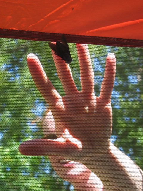 Dieses Foto ist kein Trick! Amy hält einfach nur ihre Hand an die Außenseite des Zeltes. Die Fliege war wirklich so groß. |