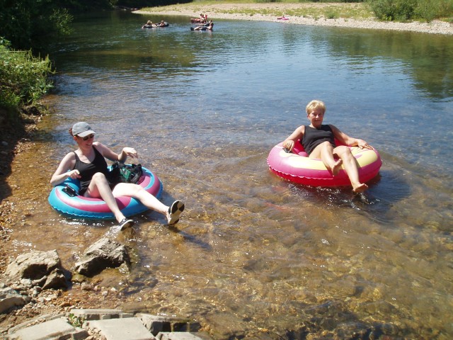 Wir treiben ein ganz schönes Stückchen den Fluß runter und es ist wirklich gemütlich. Man kann sich unterhalten, die Füße im angenehm kühlen Wasser baumeln lassen und ab und zu gibt es auch ein paar kleine Stromschnellen, wo man eine Menge Spaß beim Durchfahren hat. Mittendrin unterhalte ich mich ein wenig mit Greg, der meint, daß er aus seinem Aufblassitz ein Pfeifen hört. Ich frage ihn, ob er schon Blasen sieht, aber dazu meint er nein. Na mal sehen, ob er unten ankommt. Da das Ganze wirklich Spaß macht, fahren wir nach der Ankunft am Ziel gleich noch einmal hoch und machen das Ganze ein zweites Mal.