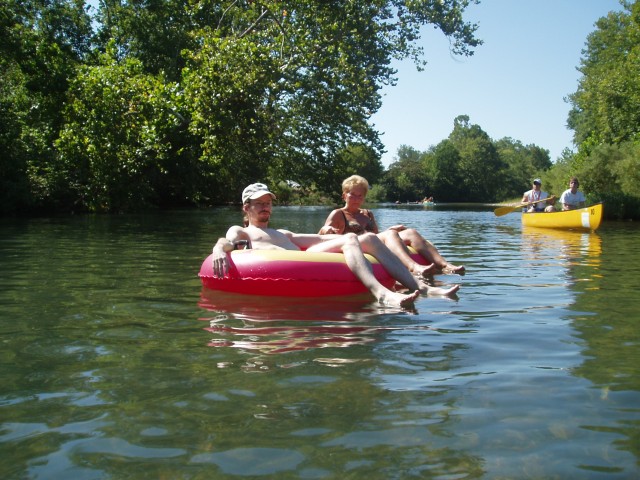 Am Nachmittag entscheiden wir uns dazu, ein paar luftgefüllte Schwimmutensilien auszuleihen und damit den Fluß runter zu treiben. Das muß hier irgendwie ein Nationalsport sein, denn der ganze Fluß ist voll mit solchen Leuten. Greg, der Ehemann von Amys Ex-Kollegin Sharon, hat sogar einen extra Transportbehälter, den man aufpusten kann und der schwimmt. In dem Behälter müssen Unmengen Bier sein, denn er kann damit mehrere Menschen versorgen. Zumindest sieht man einige mit einer Dose in der Hand.