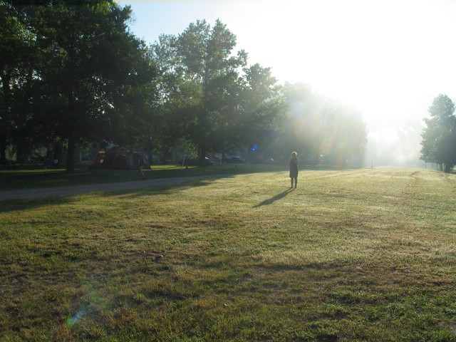 Nachdem die anderen auch wach sind, frühstücken wir gemütlich und fangen dann an, schon mal die ganzen Sachen einzupacken, denn es geht ja heute wieder zurück nach St. Louis. Ich hole derweil noch ein wenig Eis für die Kühlkiste vom Zeltplatzshop und unterhalte mich kurz mit den Betreibern, die da versammelterweise drin rumsitzen.
