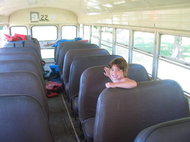 Bella in dem ollen Schulbus. Ich hab mich gleich mal ganz vorne hingesetzt, wo laut Bellas Aussage immer die Vorschulkinder sitzen. Naja. |