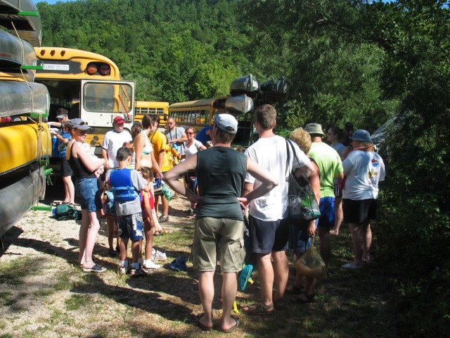 Heute steht eine Kanufahrt auf dem Fluß an. Die Kanus kann man hier überall mieten und man wird dann mithilfe eines alten ausrangierten gelben Schulbusses ein Stück flußaufwärts gebracht. Von dort kann man sich dann entweder ganz in Ruhe treiben lassen oder halt ein wenig paddeln. Wir sind die ersten, die vom Bus abgeholt werden, aber nach und nach füllt der sich ganz gut mit diversen Campern. Alle haben eine von diesen großen blauen Kühlboxen dabei, wir natürlich auch.