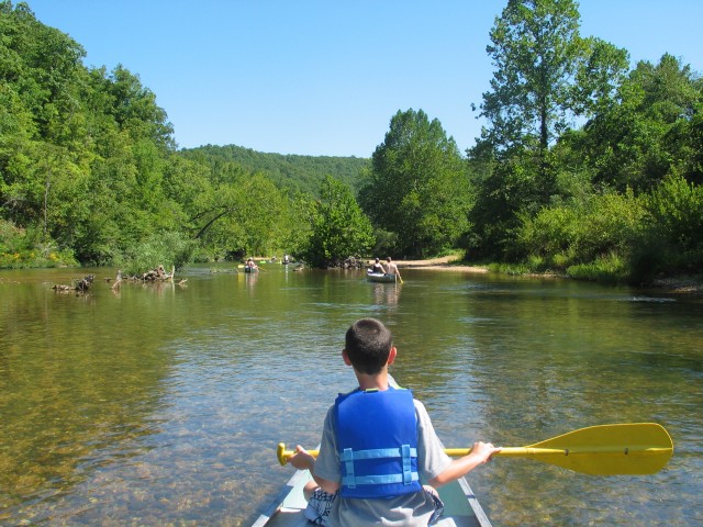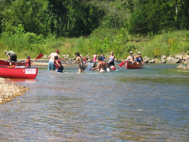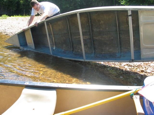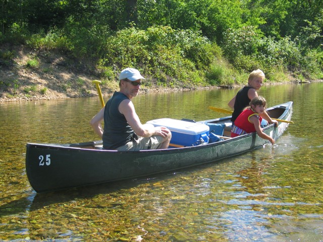 Der Fluß ist ziemlich abwechslungsreich. Mal kann man ganz gemütlich vor sich hindümpeln und mal gibt es eine ganz schöne Strömung. Das einzige was ein wenig stört ist die Anzahl der Kanufahrer. Wenn einer von denen in einem Strömungsteil zwischen Ästen oder im Wasser liegenden Bäumen hängenbleibt, dann gibt es einen Stau oder man bleibt selber stecken, weil man nicht ausweichen kann. Was aber noch ein bißchen mehr stört sind die auf aufblasbaren Teilen dümpelnden Menschen. Die bewegen sich nämlich nicht mal, wenn es eng wird und man eigentlich aufpassen muß. Und so fahren Nick und ich erstmal eine dicke Frau über den Haufen. Naja, nicht richtig, aber wir quetschen sie zumindest zwischen unserem Boot und einer Felswand ein. Nick findet das klasse, aber der ist eh destruktiv veranlagt.