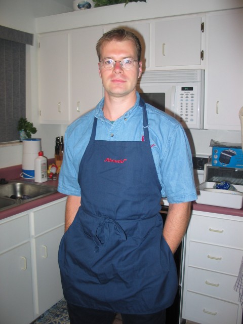 Mein Bruder in seinen Arbeitsklamotten. Ich finde, er sieht eher wie ein Obstverkäufer, als wie eine Reinigungsfachkraft aus. |