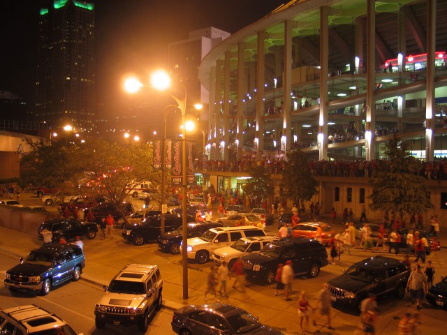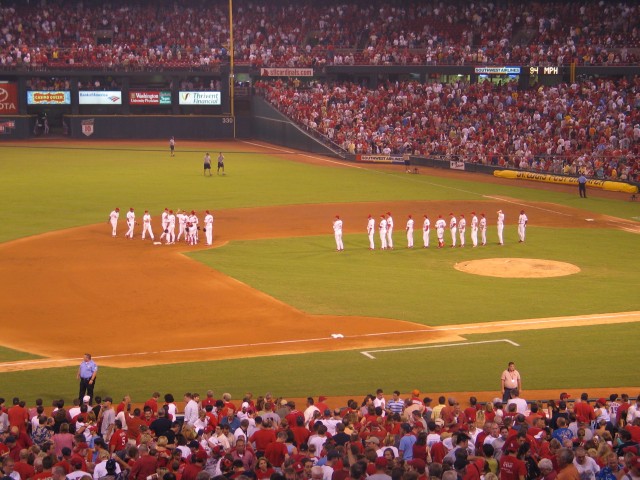 Nach circa einer halben Stunde Spielzeit hab ich dann auch die Regeln soweit verstanden, daß es spannend wird. Wichtig zu wissen ist zum Beispiel, daß wenn der geschlagene Ball von einem Fänger direkt aufgefangen wird, der Schläger gleich raus ist. Alles klar? Muß man wahrscheinlich mal live sehen. Aber immerhin ist das Spiel recht spannend. St. Louis geht zwar mit einem Punkt im ersten Inning in Führung, muß dann aber im sechsten Inning zwei Punkte an die Mets abgeben. Im siebten und achten Inning dreht sich das ganze dann wieder in Richtung Cardinals, die letztlich auch das Spiel mit 3 zu 2 Punkten gewinnen. Einen Homerun, wo der Ball so weit geschlagen wird, daß er außerhalb des Spielfeldes aufkommt, gibt es dabei auch noch, natürlich für die Cardinals, was in einen ziemlichen Jubel seitens des Publikums ausartet.