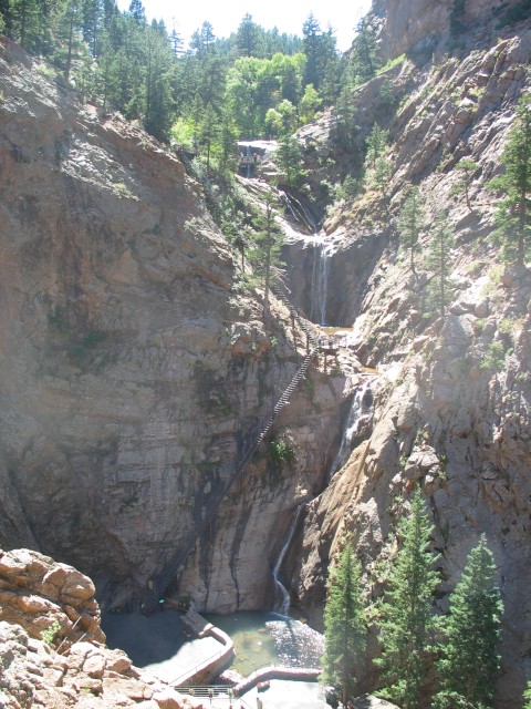 Mein Bruder hat schon sämtliche interessanten Punkte herausgesucht und so steht in Colorado Springs der Besuch der Seven Falls an. Dies ist ein Wasserfall, der in sieben Stufen eine ziemliche Höhe überwindet. Da ich wegen dem Computerabsturz gestern nicht die nächsten Karten auf mein GPS laden konnte, müssen wir die altertümliche Methode des Kartenlesens wiederbeleben. Dabei versagt mein Vater in sämtlichen Belangen und wir landen in einer ziemlich noblen Wohngegend. Das ist zwar auch recht interessant, aber nicht das, was wir wollten. Amy sitzt gerade auf dem Beifahrersitz und wie Frauen im Gegensatz zu Männern so sind, fragt sie einfach ein paar Leute, die gerade auf dem Bürgersteig herumlaufen. Diese haben auch keine Ahnung, aber das ist kein Wunder, denn sie kommen aus New Orleans. Upps... (Falls sich das hier jemand in fünf Jahren noch mal durchliest, da war gerade der Hurrikan Katrina und hat die Stadt überflutet.)