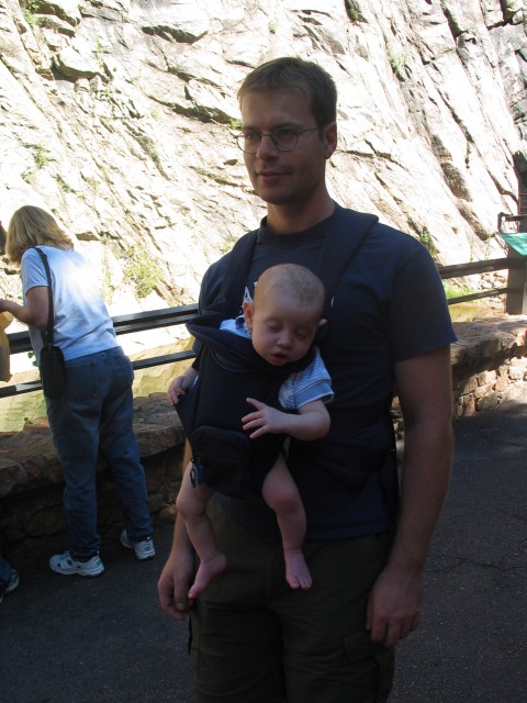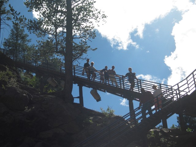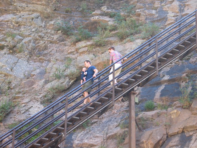 Mir macht die dünne Luft ein bißchen zu schaffen, ich brauche da immer ein wenig Zeit, mich zu aklimatisieren. Meinen Eltern und meinem Bruder macht das gar nix und die Kinder toben auch rum, als sei gar nichts. Nur Amy hechelt auch ein wenig, aber sie schiebt das darauf, daß sie ja gerade erst die Schwangerschaft hinter sich hat. Ob Daniel wegen der dünnen Luft oder aus purer Lust ein Nickerchen macht, weiß ich allerdings nicht. Als erstes kann man mit einem Aufzug auf einen Felsen fahren, der gegenüber den Wasserfällen ist. Nachdem wir den dort befindlichen Souvenirshop geplündert haben, geht es hinüber zu der großen Treppe. Auf halbem Weg zur ersten Zwischenstation überlege ich, ob das so eine gute Idee war. Ich laufe zwar extra langsam, aber bin schon mächtig außer Puste. Bei der ersten Zwischenstation muß ich mich dann erstmal hinsetzen und wie ich da so gemütlich mit Amy sitze überlege ich mir, daß ich nicht weiter gehen will. Das ist mir einfach zu riskant. Amy hingegen rafft sich noch mal auf und klettert den zweiten Teil auch noch. Ich bleibe sitzen und mach ein paar Fotos.