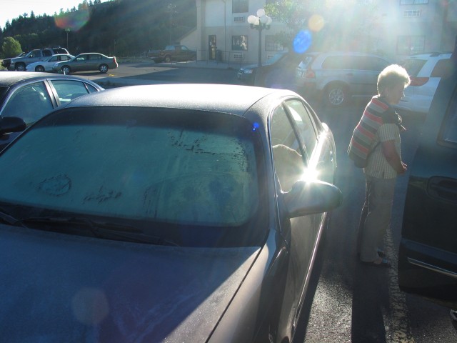 Man merkt, daß wir hier in den Bergen sind, denn draußen ist es mächtig kalt. Mein Vater und Jörg, die als Frühaufsteher und Morgens-gute-Laune-Haber vor dem Frühstück schon zum Tanken fahren, müssen sogar Eis von der Windschutzscheibe kratzen. Demzufolge ist heute Tag der langen Hose.