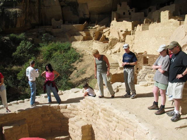 Das Loch, wo alle reinkucken ist ein sogenannter Kiva. Da drinnen brannte ein Feuer, es gab auch ein Dach und ein ausgeklügeltes Ventilationssystem. Wahrscheinlich benutzte man das für religiöse Zwecke. |