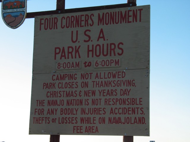 Der letzte Punkt, der heute noch ansteht ist das Four Corners Monument, der einzige Punkt in den USA, wo 4 Bundesstaaten aufeinander treffen, nämlich Colorado, Utah, New Mexico und Arizona. Ist zwar eigentlich nur eine willkürlich festgelegte Sache, aber als olle Ossis haben wir es wohl mit Grenzen ganz besonders. Außerdem sind Jörg, Amy und ich ja Bundesstaatensammler und so können wir unsere Sammlung ein wenig vervollständigen. Dummerweise sind wir ein bißchen spät dran und so ist, auch wenn das komisch klingt, schon geschlossen. Das ist natürlich total enttäuschend.