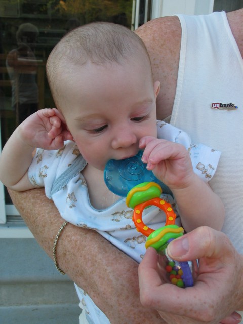 ... und hat Mokel was mitgebracht: Seinen allerersten Beißring. Da wird erst mal ordentlich zugepackt. U.S. Bank ist übrigens Amys Arbeitgeber, wie man auf bundesdeutsch zu sagen pflegt. |