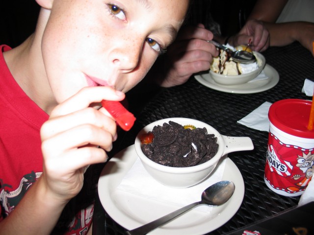 Das Essen heute abend soll natürlich noch mal ein bißchen opulenter ausfallen. Deswegen fahren wir zu T.G.I. Friday's, einer der ersten Restaurantketten, die es in den USA gab. Dort gibt es typisch amerikanisches Essen mit leckeren Steaks. T.G.I. Friday steht übrigens für "Thank God It's Friday" und es gibt sogar ein einziges Restaurant in Deutschland, genauer gesagt in Heidelberg. Die Kinder dürfen sich wieder einen Nachtisch bestellen und diesmal gibt es etwas ziemlich ekliches: Einen Cup of Dirt, also eine Tasse Dreck.